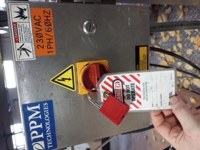 | 101 | 1046 | Conveyor - Incline to Buffer - Kettle | Step 1 | Electricity 220V | | Lock out pad lock | Main electrical switch | Lock and tag out switch | No power | Link to Picture | 2023-01-25 11:30:27 |
